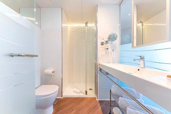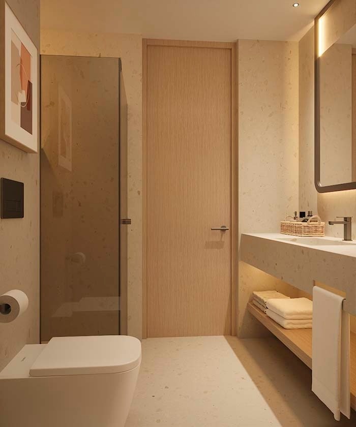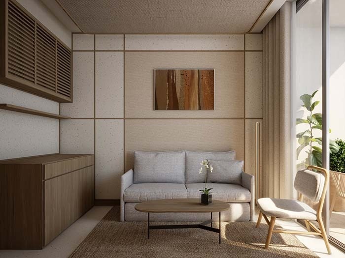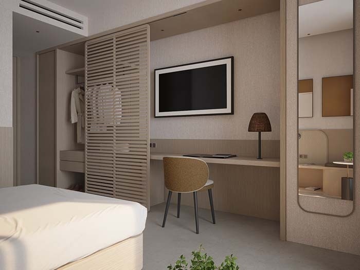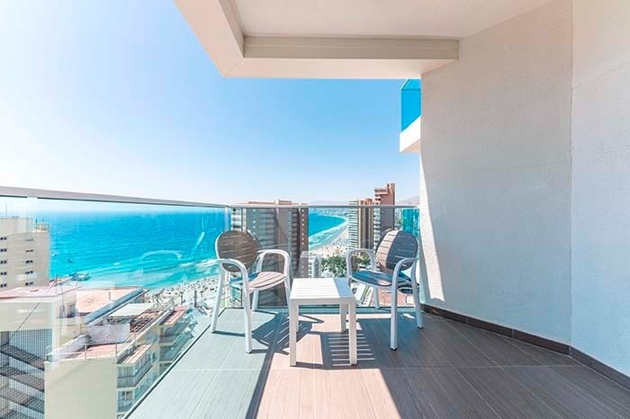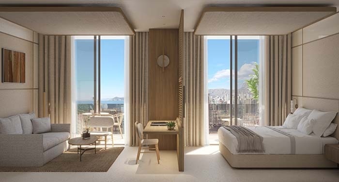 Situada en la Sky Tower, entre la 9ª y la 17ª planta, esta habitación presenta un diseño contemporáneo que resalta la calidez de los materiales naturales, creando un ambiente acogedor y sofisticado. Con capacidad máxima para 2 personas, su terraza con vistas panorámicas al Mediterráneo ofrece una experiencia única, ideal para quienes buscan una estancia elevada en lo más alto de Benidorm.