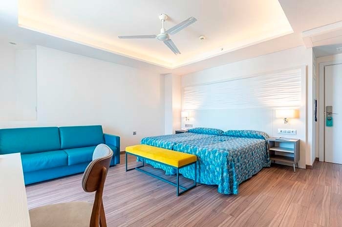 Situada en la Blue Tower, esta habitación es la más espaciosa, pensada para ofrecerte una experiencia única de amplitud y luminosidad. Con capacidad para 3 adultos y 1 niño o 2 adultos y 2 niños. Su terraza con vistas espectaculares al mar Mediterráneo, crea el ambiente perfecto para disfrutar en familia.