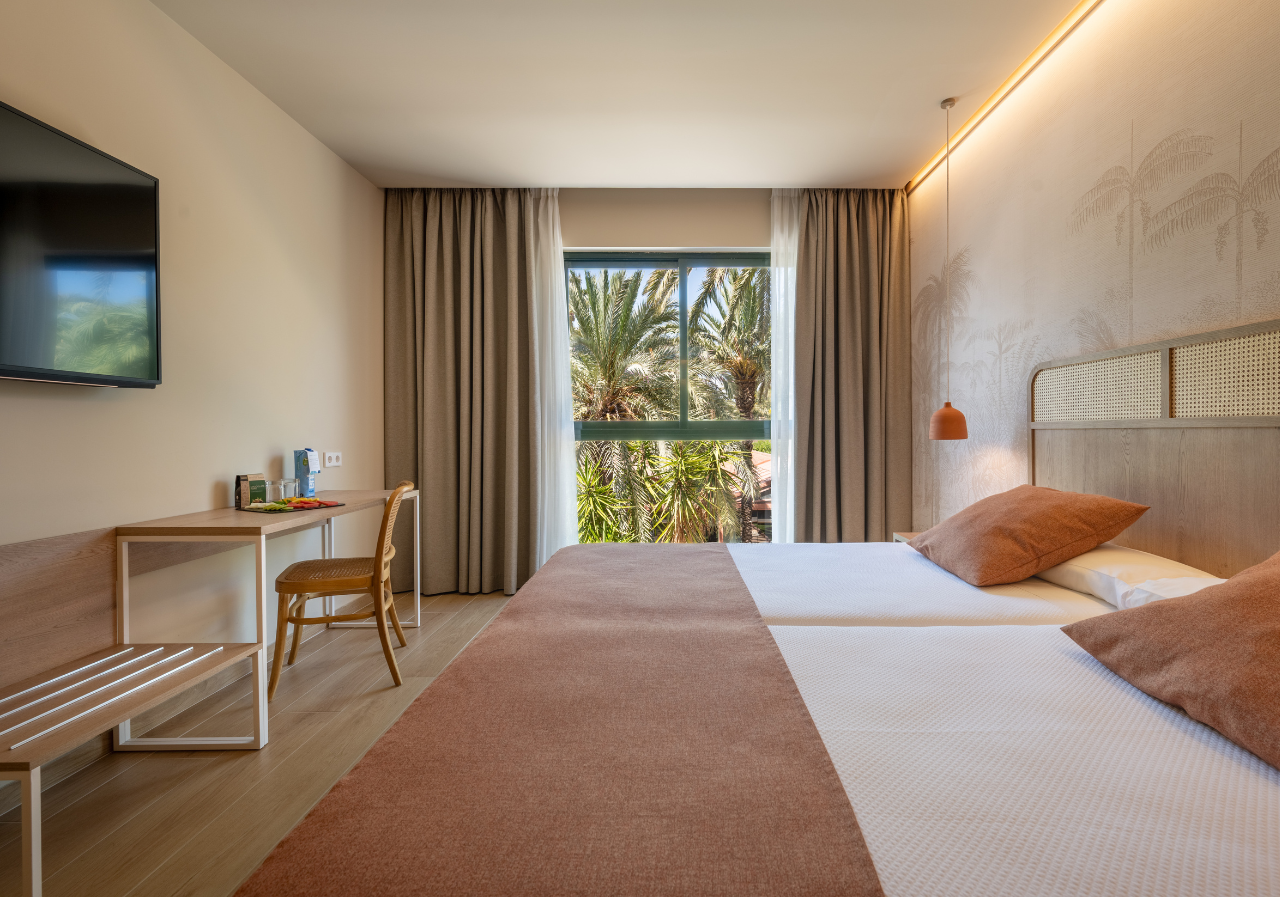Las habitaciones Junior Suite son muy amplias y están pensadas para alojar cómodamente hasta 4 personas (máximo 2 adultos). Disponen de cama de matrimonio o de dos camas individuales en función de la disponibilidad, además de un sofá cama doble.